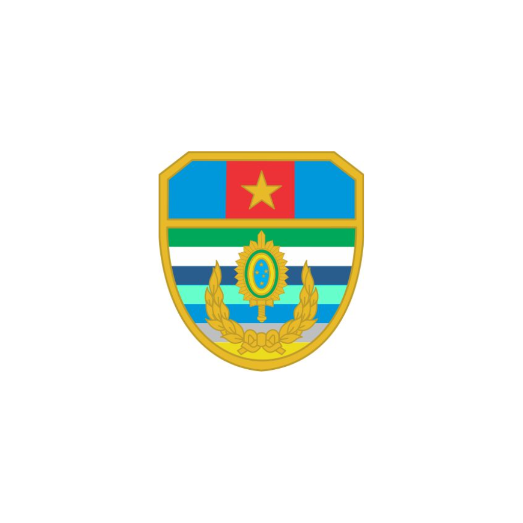 DESIGN E SIMBOLOGIA MILITARO distintivo apresenta um escudo peninsular português com cantos superiores chanfrados e filetado em dourado, transmitindo sofisticação e identidade militar. O chefe do escudo é dividido em três partes, sendo as extremidades em azul-celeste e o centro em vermelho com uma estrela dourada, simbolizando liderança e mérito. O campo do escudo é composto por faixas coloridas em verde, branco, azul-ultramar, azul-turquesa, azul-celeste, cinza-aço e amarelo, representando diversidade e formação técnica. No centro, em destaque, está o símbolo do Exército em suas cores originais, laureado em dourado, reforçando o prestígio e a honra do curso.
