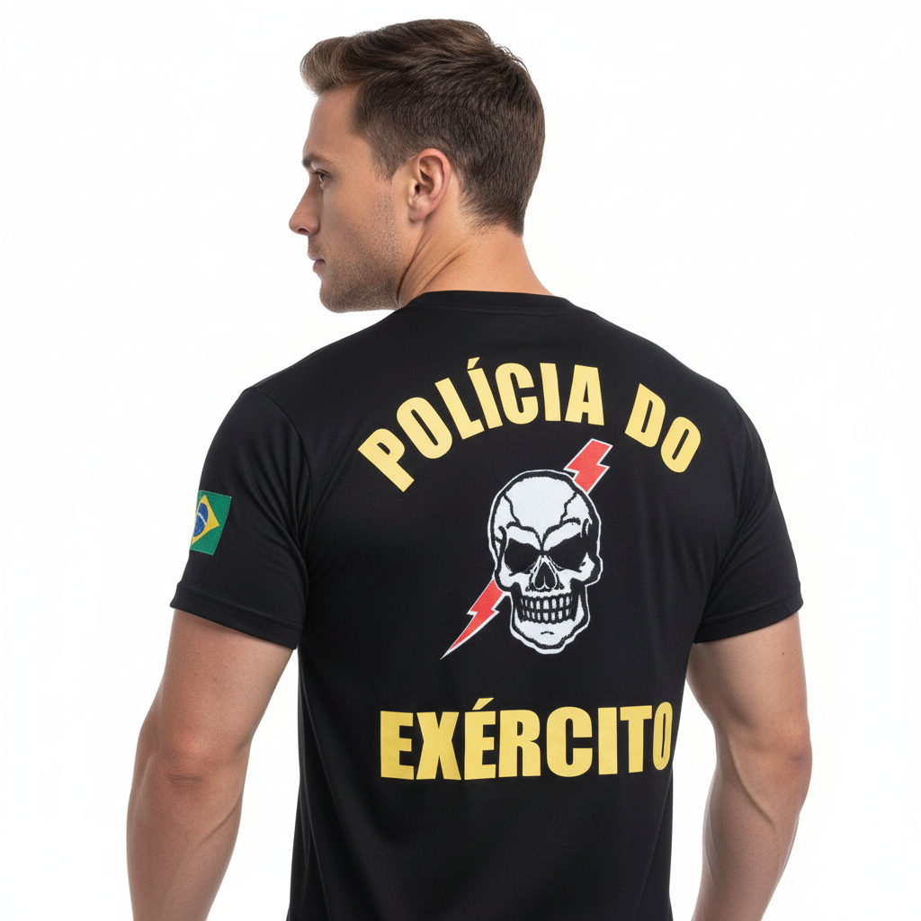 DESTAQUES DA ESTAMPA Arte traseira grande com a inscrição “POLÍCIA DO EXÉRCITO”. Caveira central com dois raios vermelhos, símbolo tradicional de coragem e prontidão. Bandeira do Brasil aplicada na manga. Sigla “PE” (Polícia do Exército) na outra manga. Cores firmes e bem definidas, com excelente cobertura na malha.