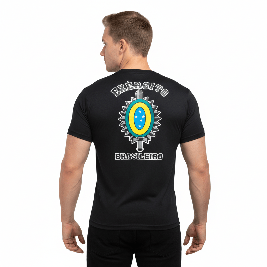 BENEFÍCIOS E USOO ponto forte do tecido é a praticidade no uso e na manutenção: a camiseta é pensada para aguentar a rotina, mantendo bom caimento e aparência por mais tempo. Por ser feita em Helanca Light ou Poliviscose (dependendo da disponibilidade), é uma ótima opção para quem procura camiseta preta estampada com maior durabilidade, boa respirabilidade e conforto para usar em diferentes climas. A estampa com o Símbolo EB reforça a identidade do estilo militar de forma objetiva, sendo uma escolha certeira para presentes e para quem quer montar um visual tático casual com uma camiseta temática do Exército Brasileiro.