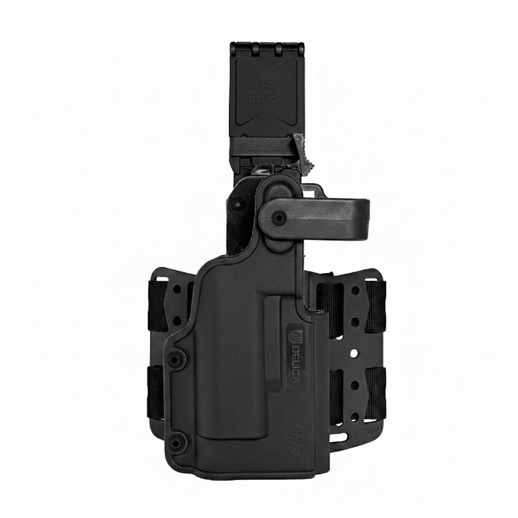 INFORMAÇÕES SOBRE O PRODUTOO Coldre Black Light II - Coxa (Bélica) é um coldre tático de perna desenvolvido para operadores, atiradores esportivos e profissionais de segurança que buscam transporte seguro, retenção reforçada e saque rápido da arma de fogo. Produzido em polímero de alta resistência, oferece excelente durabilidade, resistência a impactos e estabilidade mesmo em uso intenso. Seu sistema de travamento duplo (Dual Lock System) impede o destravamento indevido, mantendo a pistola firme e pronta para uso imediato. A plataforma de coxa PRO possui design anatômico, fitas elásticas emborrachadas de alta aderência e regulagens múltiplas de altura e angulação, garantindo conforto, ajuste personalizado e máxima eficiência operacional. A imagem ilustrativa demonstra o conjunto robusto com plataforma de coxa, sistema rotativo e coldre com encaixe estruturado, reforçando o padrão tático profissional do equipamento.