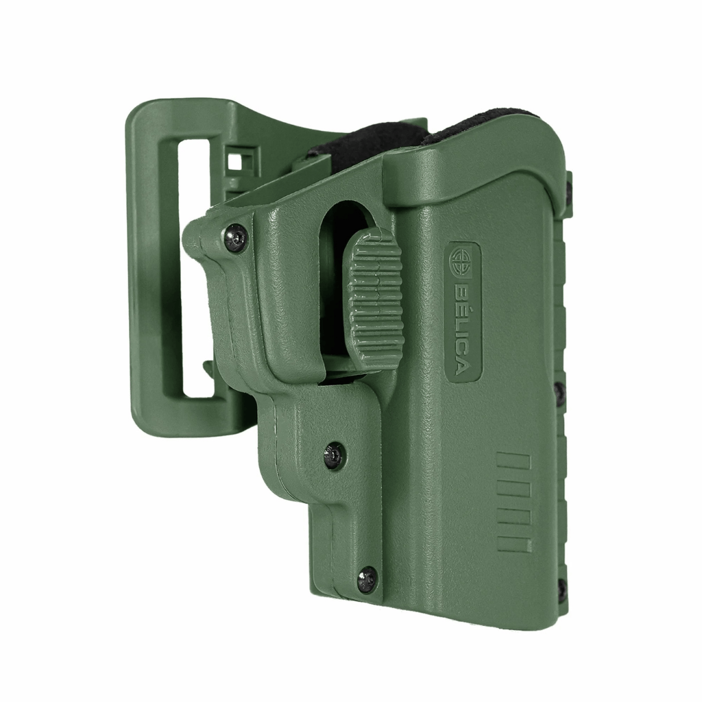 DESTAQUES E BENEFÍCIOS• Retenção nível I com trava ativa: mais segurança e rapidez no saque.• Polímero de alta resistência: durabilidade e desempenho em uso intenso.• Revestimento interno em couro: protege a arma e diminui o atrito entre coldre e pistola.• Catraca rotativa: permite ajustar a angulação do coldre na base para melhor ergonomia.• Passador de cinto com encaixe e soltura rápida: praticidade para colocar e remover o equipamento.• Compatibilidade com plataformas Bélica: a catraca também auxilia na fixação em outras bases compatíveis.Ideal para quem procura coldre Bélica de cintura com passador, coldre com catraca rotativa e coldre com retenção ativa para uso profissional ou esportivo.