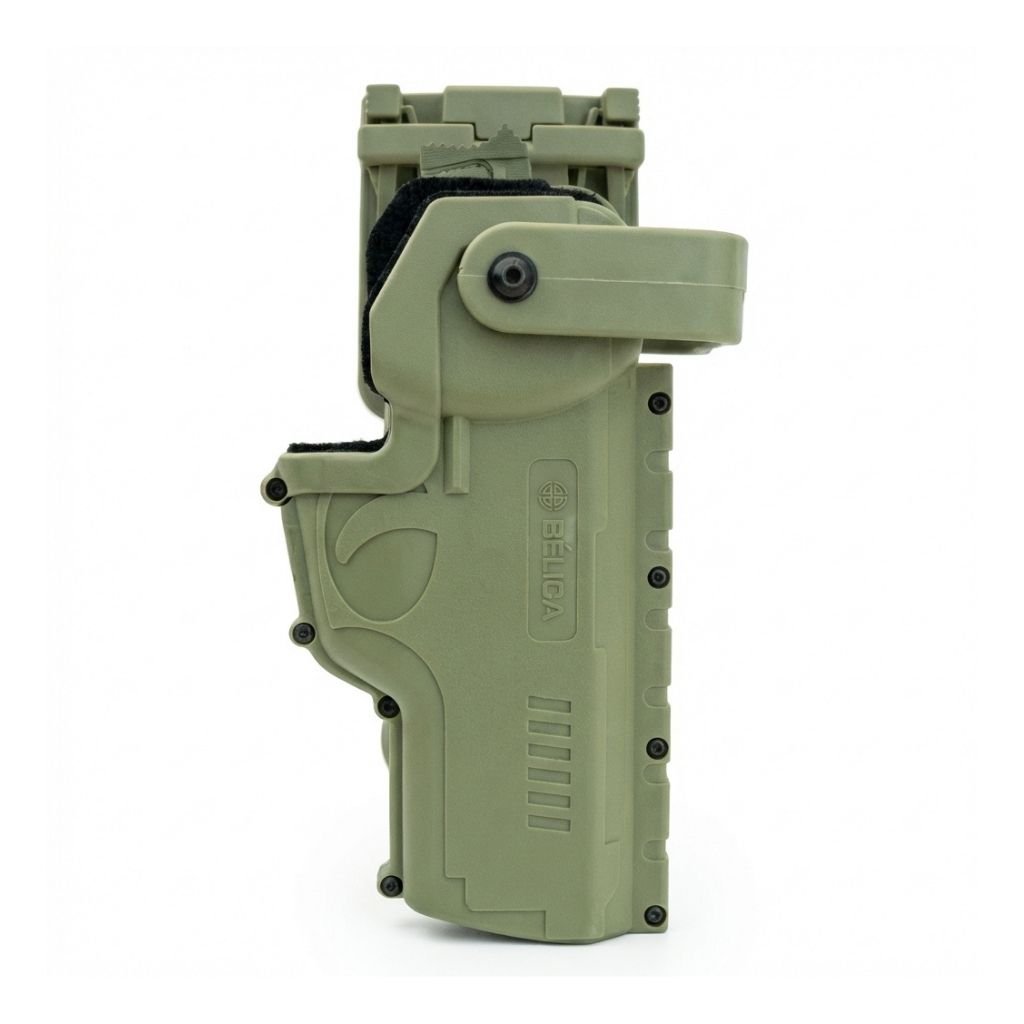 CARACTERÍSTICAS E DIFERENCIAIS TÉCNICOSO Coldre Hammer I conta com retenção nível II, proporcionando dupla segurança no porte da arma. Possui 1 retenção ativa através do protetor de botão de liberação da alça e 1 retenção ativa por alça antiarrebatamento (Thumb Break), aumentando a proteção contra tentativas de saque não autorizado. Desenvolvido em polímero de alta resistência, suporta uso intenso em serviço operacional. O Dual Lock System evita abertura acidental. O revestimento interno em couro protege o armamento e reduz desgaste. A catraca rotativa permite ajuste do ângulo do coldre, oferecendo maior conforto no manuseio e possibilitando fixação em outras plataformas Bélica compatíveis. O Passador de Cinto I também é fabricado em polímero de alta resistência, com plataforma confortável, sistema de encaixe e soltura rápida, compatível com cintos de até 55 mm e com catraca rotativa para ajuste preciso da posição na cintura.