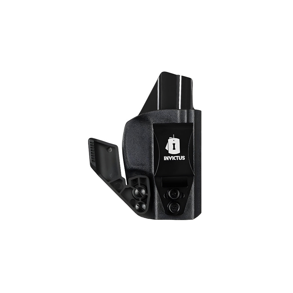 DESTAQUES E DIFERENCIAIS O coldre IWB INVICTUS conta com duas opções de clip de fixação, permitindo personalização conforme a preferência do usuário. O clip em polímero POM oferece leveza e alta resistência, enquanto o clip metálico em aço inoxidável proporciona maior robustez e ajuste de ângulo, ambos com regulagem de altura para melhor adaptação ao cinto. Possui ajuste de retenção preciso e fácil, realizado por meio de dois parafusos Philips M4, garantindo saque seguro e fluido. O modelo inclui ainda uma aba dissimuladora de volume, que reduz o relevo da arma sob a roupa, podendo ser removida conforme a necessidade, com kit extra de parafusos incluso para essa configuração.