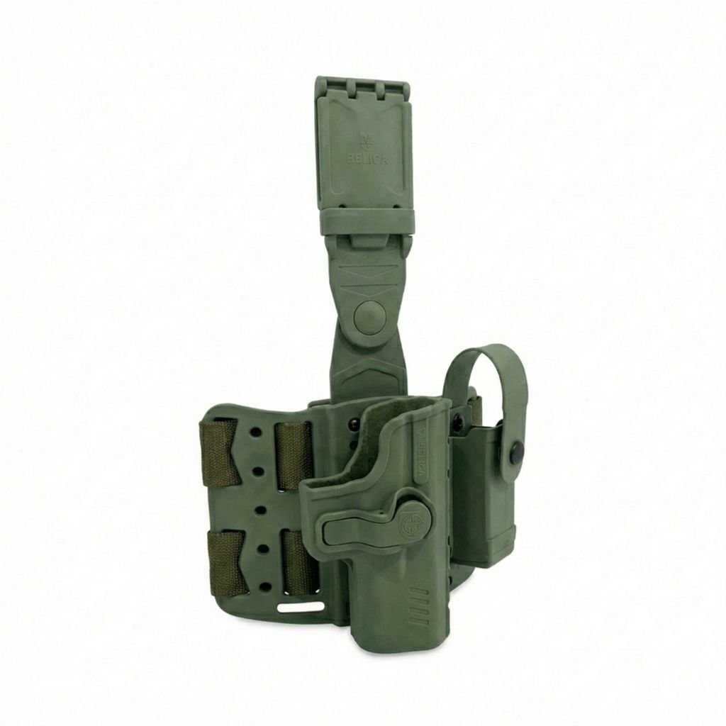 DIFERENCIAIS E FUNCIONALIDADESO Coldre PRO SR conta com estrutura robusta em polímero de alta resistência, sistema de trava para saque rápido e catraca compatível com outras plataformas Bélica. O porta-carregador simples suporta 1 carregador, possui botão de fechamento superior e lingueta de retenção que evita perdas em situações extremas. A Plataforma PRO foi projetada para acompanhar a anatomia da coxa, oferecendo conforto prolongado e estabilidade superior. Dispõe de 8 níveis de regulagem de altura, sistema Belt-Lock Spin com trava para liberação do cinto de guarnição, fitas emborrachadas altamente aderentes que evitam deslocamentos e fivelas com trava tripla para máxima segurança. A fita de fixação possui 90 cm com fecho de 3 pontos, garantindo ajuste firme e personalizado. Um conjunto completo para quem procura coldre tático profissional com plataforma ajustável, coldre de perna para uso operacional e equipamento tático de alta performance.