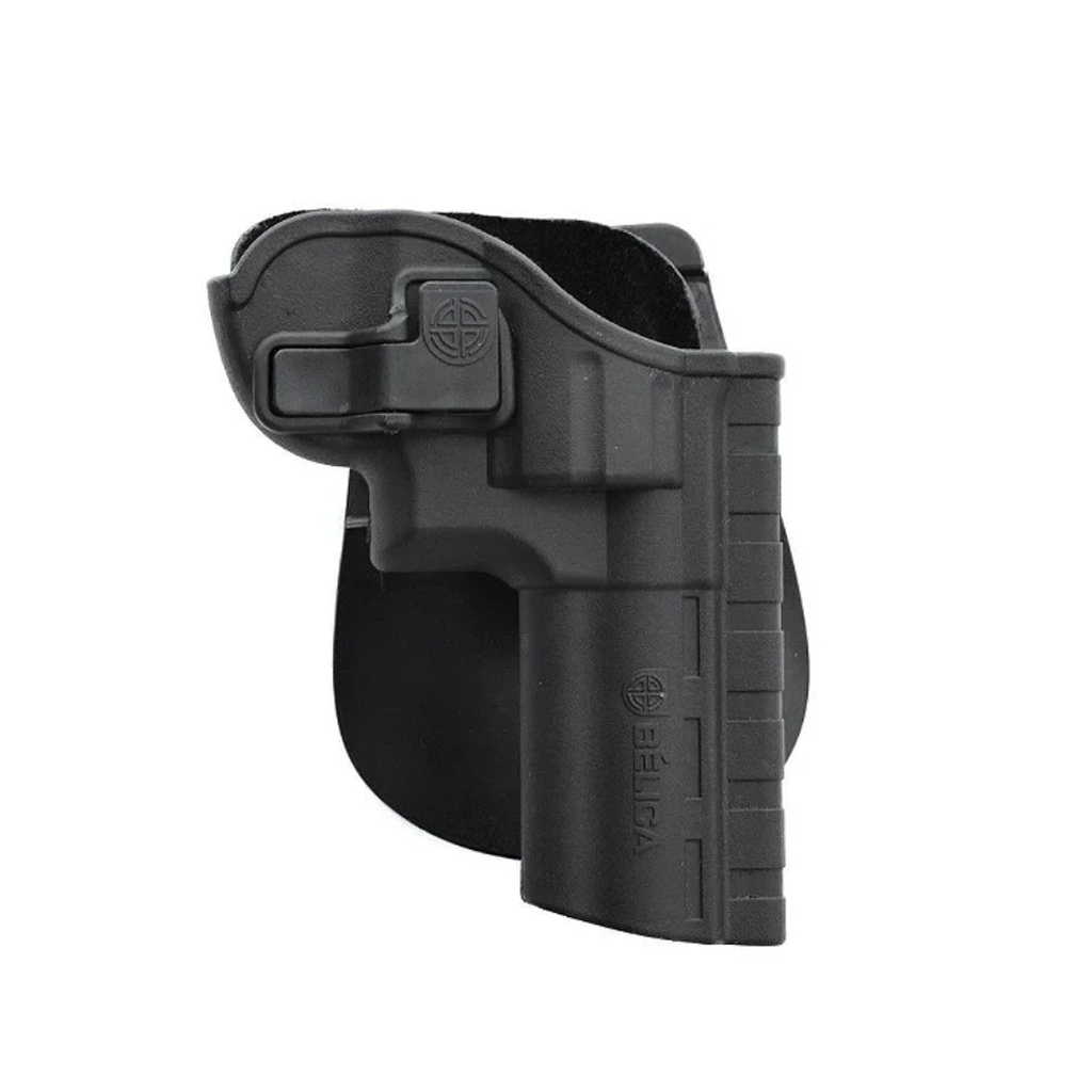 FUNCIONALIDADE E BENEFÍCIOSFabricado em polímero de alta resistência e injetado em peça única, o Coldre Revólver Paddle Bélica oferece retenção nível I com trava de saque rápido, proporcionando equilíbrio ideal entre segurança da arma e velocidade de resposta. O revestimento interno reduz o atrito entre arma e coldre, preservando o acabamento do revólver e aumentando a durabilidade do equipamento mesmo em rotinas intensas de uso tático. A plataforma Paddle é anatômica e confortável, distribuindo melhor o peso do conjunto na cintura, enquanto a catraca rotativa permite ajustar o ângulo de porte para saque cruzado, porte mais vertical ou levemente inclinado, conforme a necessidade operacional do atirador ou agente de segurança.