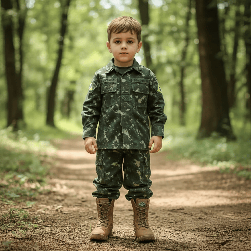 POR QUE ESCOLHER ESTA FARDA INFANTIL O conjunto une calça e gandola para um visual completo e alinhado, com presença marcante do camuflado e caimento confortável. Por ser produzido em tecido de alta solidez, ajuda a manter a aparência do uniforme por mais tempo, sendo uma excelente escolha para quem procura farda infantil camuflada do Exército Brasileiro com boa durabilidade. É uma opção versátil para quem busca uniforme militar infantil para fantasia, coleção, recreação e atividades que pedem um look temático bem característico.