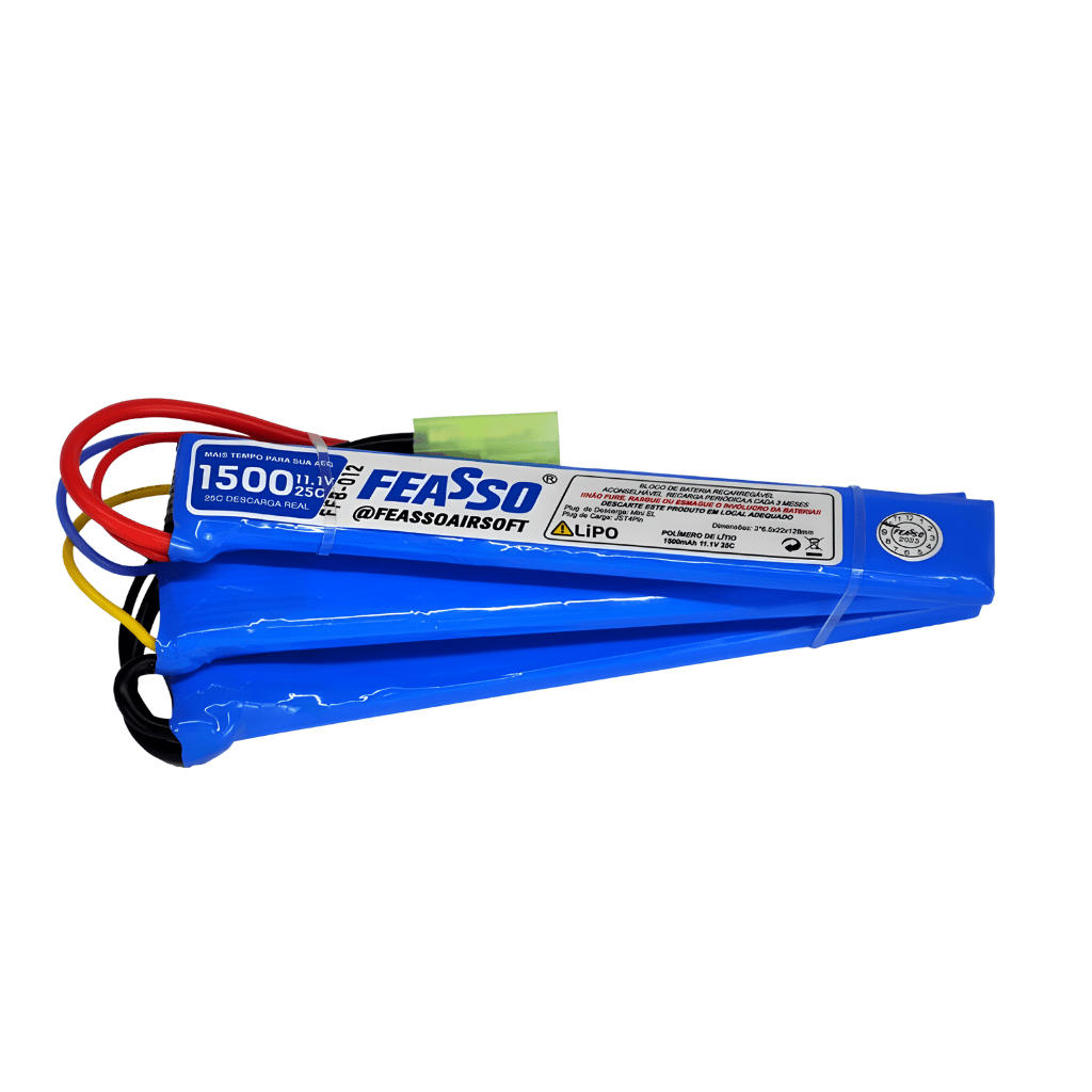 INFORMAÇÕES SOBRE O PRODUTO A Bateria LiPO FFB-012 25C 11.1V 1500mAh foi desenvolvida pela Feasso para oferecer desempenho superior em AEGs de Airsoft, especialmente aquelas com upgrade ou exigência de maior potência. Projetada com tecnologia avançada em polímero de lítio, ela entrega descarga estável, resposta imediata e alta eficiência energética, proporcionando maior cadência de disparo e melhor performance geral. Reconhecida pela durabilidade e segurança, a linha Feasso passa por rigorosos testes de qualidade, garantindo ao usuário um produto confiável, seguro e ideal para uso intenso no Airsoft. Seu formato compacto facilita a instalação, tornando-se compatível com diversos modelos de rifles elétricos.