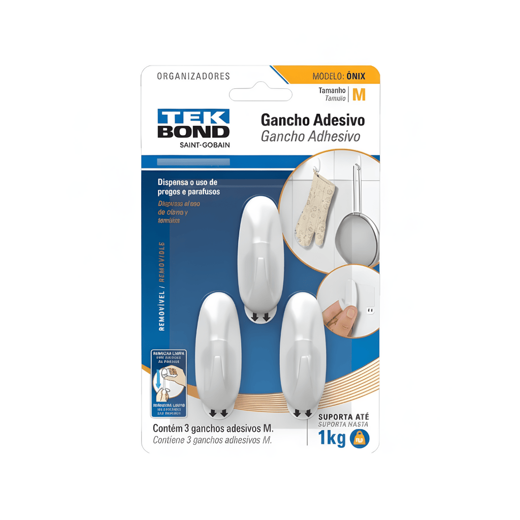 PRATICIDADE E FIXAÇÃO ADESIVACom aplicação adesiva de alta eficiência, o Gancho Tek Bond ÔNIX dispensa o uso de ferramentas, furos ou parafusos, preservando paredes e superfícies. Cada gancho suporta até 1 kg quando aplicado corretamente conforme as instruções da embalagem, sendo indicado para pendurar chaves, panos, utensílios leves, acessórios, cabos, toalhas e diversos objetos. Fabricado em plástico resistente, garante boa durabilidade e uso confiável em diferentes ambientes.