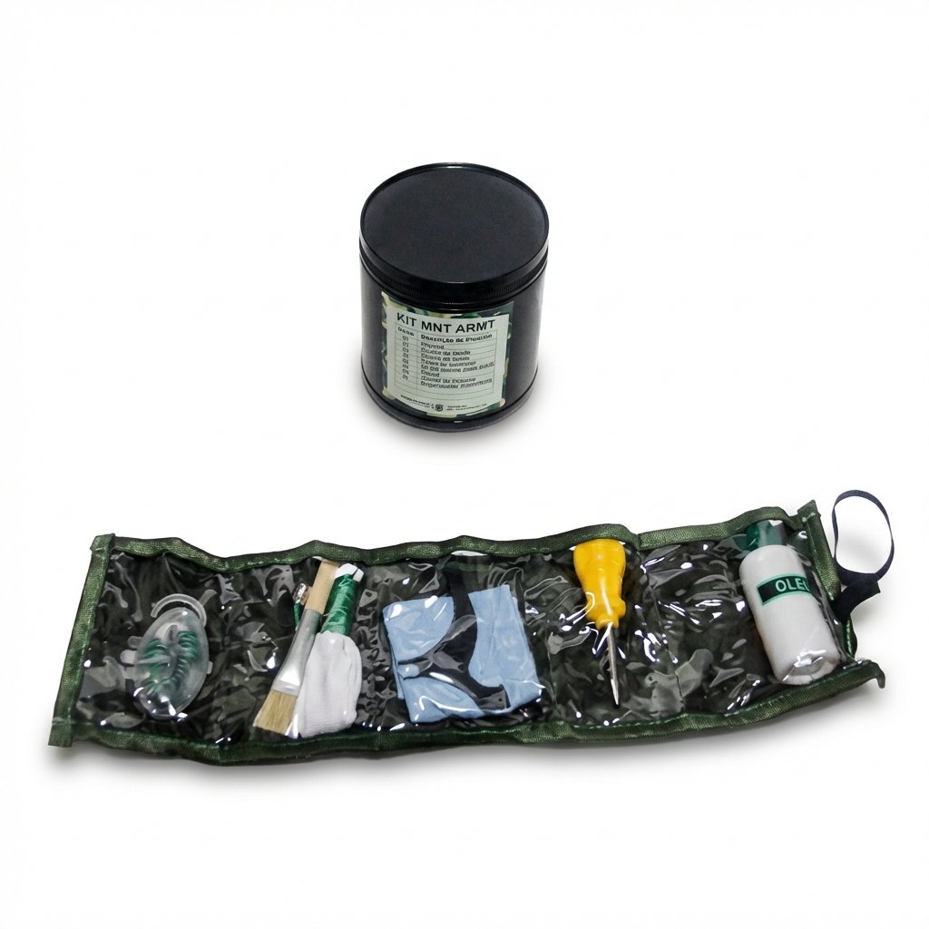 INFORMAÇÕES TÉCNICASMarca/Fabricante: Operacional KitsAplicação: Acampamento militar e uso operacionalConteúdo do kit: 01 pote plástico 700 g (preto); 01 cordel de limpeza; 01 flanela (azul); 01 frasco conta-gotas com óleo (30 ml); 01 chave de fenda; 01 chave de clicar; 01 pincel; 01 protetor auricular; 01 organizador de kit pequeno (camuflado); 01 adesivo com a descrição dos itens do kitDimensões do kit fechado: altura 10,5 cm; diâmetro 9,5 cmPeso: 175 gObservações: fotos ilustrativas; medidas aproximadas.