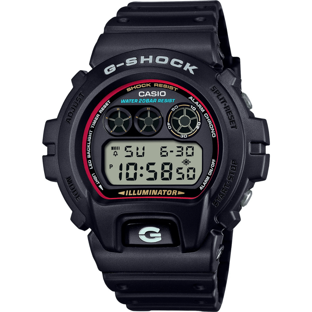 RECURSOS, DURABILIDADE E ILUMINAÇÃO Equipado com o módulo digital 3230, o G-SHOCK DW-6900-1VDR oferece cronômetro completo, temporizador ajustável, alarmes multifuncionais e sinalização por hora. O alerta piscante combina aviso sonoro e visual para facilitar a percepção das notificações. O fundo eletroluminescente com persistência luminosa e luz turquesa garante leitura clara mesmo em ambientes de baixa iluminação. Sua estrutura à prova de choques, caixa em resina, pulseira resistente e vedação contra água de até 200 metros tornam este modelo ideal para quem busca segurança e confiabilidade em todas as atividades, sejam esportivas, profissionais ou do dia a dia.